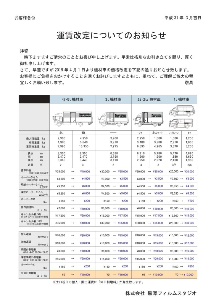 機材車運賃改定のお知らせ 2019年5月4日2019年5月5日 kurosawa 2019年4月1日から機材車の価格改定を致します。 詳しくは下記の添付ファイルをご確認ください。 皆様には何卒ご理解を賜りますとともに、今後ともご愛顧の程よろしくお願い申し上げます。