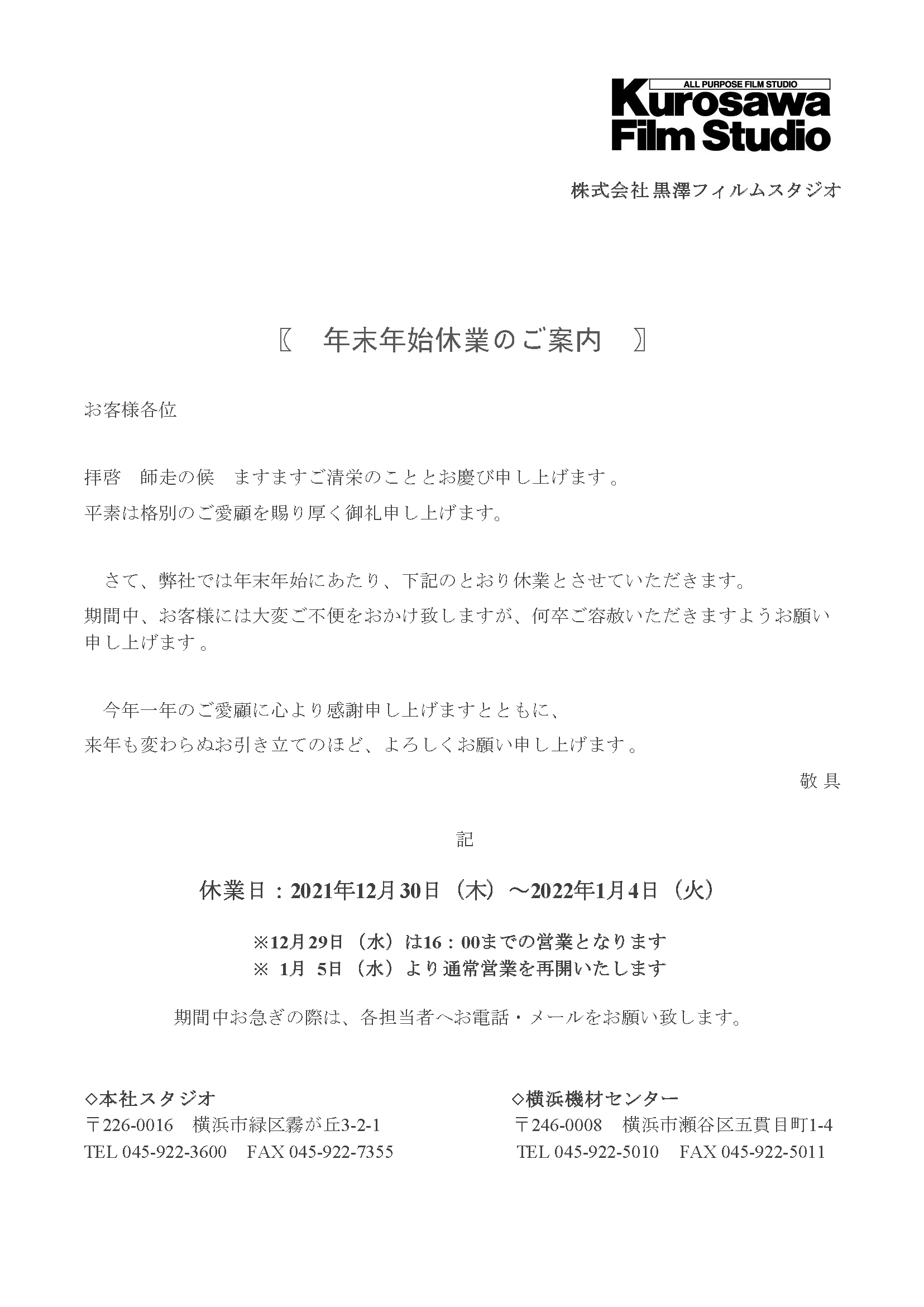 年末年始休業のご案内