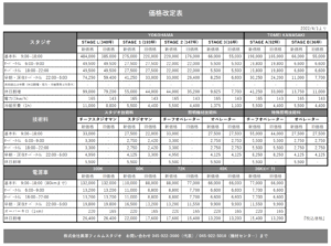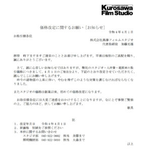 さて、誠に心苦しいお知らせではありますが、弊社のスタジオ・人件費・電源車の取引価格につきまして、4月1日のご発注分より、下記のとおり改定させていただきたく、謹んでここにお願い申し上げます。